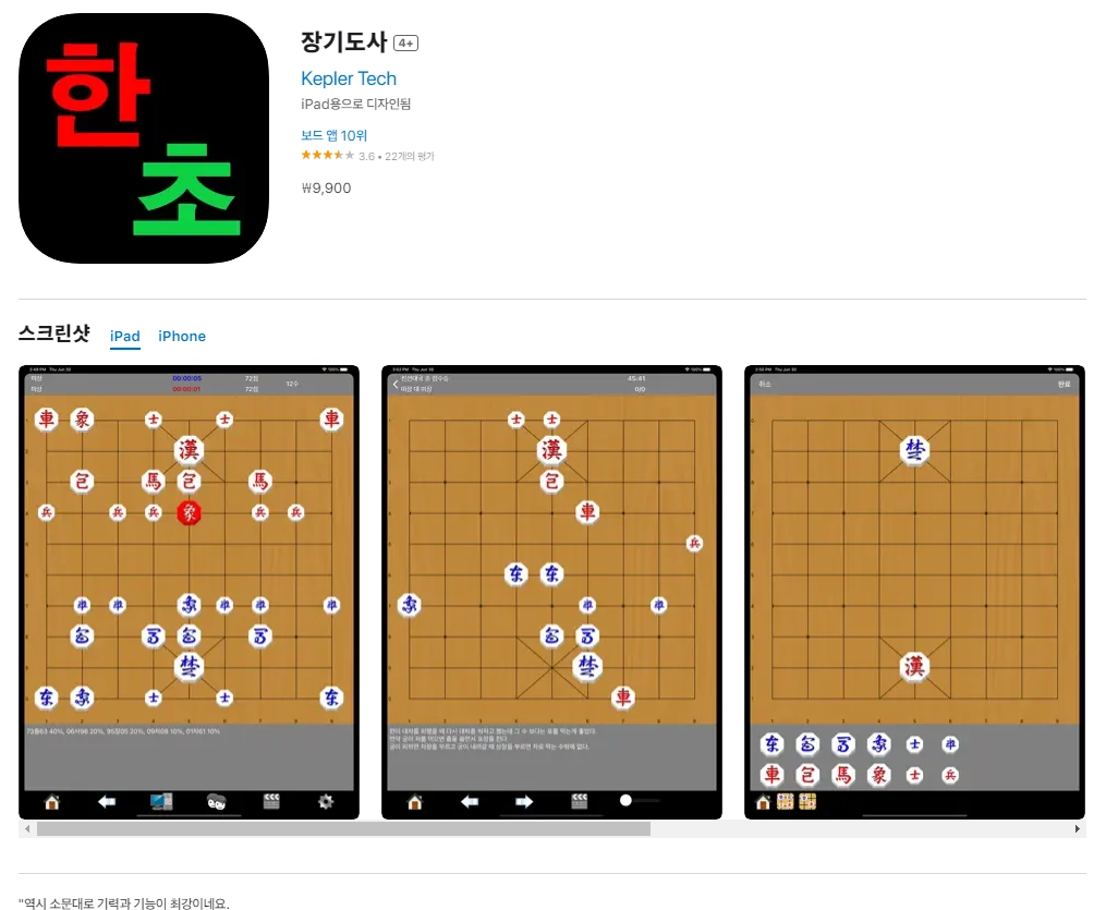 ▶ pc버전구매후 아이패드로. 할수있는데도(크레이지리모트) 어플또 구매함. 다른 프로그램이나 어플과 비교불가하며. 최고수에게 진다면 평범한사람 비긴다면 정말동네에서 장기로 방귀좀 뀐다고 해도됨. 만약이긴다면 프로 입문하셔도 됨. 넷마블및엠게임9단들과 장도로 대결결과 대략. 700승 20패 50무 제 pc와 어플대결시켜서. 누가이기는지 해보니 엇비슷하지만 제pc경험치덕분인지. 1승1무인데 귀마대 귀마만 해봤는데 면포면상변칙등. 도움 많이됩니다 프로들도 장도로 연구한다지요,, 암튼 pc버전처럼. 앱스토어에서도 승승장구하시길.. 티스토어및 유니버셜 기대할게요..핸펀은 갤2라서 ㅎ 티스토어에 나와도 또구매할꺼임