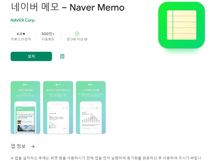 이 어플은 구글플레이스토어에서 "무료 메모"로 검색했을때 4번째로 나오는 어플입니다. 아래는 네이버 메모 – Naver Memo 어플에 대한 자세한 설명이니 참고하세요.