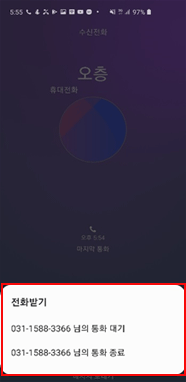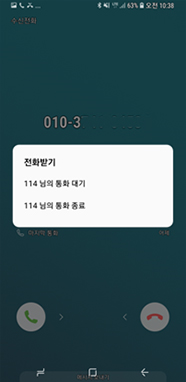2. 제 3자에게 수신된 전화를 받으면 [통화 대기 통화 종료] 팝업 화면이 뜨는데 [통화대기]를 누르면 처음 통화중인 사람은 대기 상태가 되고 [통화종료]를 누르면 처음 통화중인 사람과는 통화가 끊어지면서 제 3자와 통화가 연결됩니다.