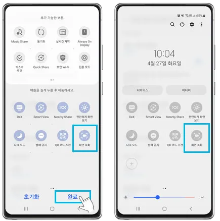 3. 화면 녹화를 빠른 설정창으로 끌어 놓은 다음 [완료]를 누릅니다. 이제 빠른 설정창에서 화면 녹화를 찾을 수 있습니다.