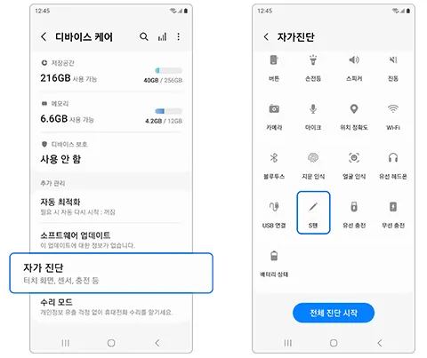 2. S펜 자가 진단을 통해 이상여부를 점검하세요.