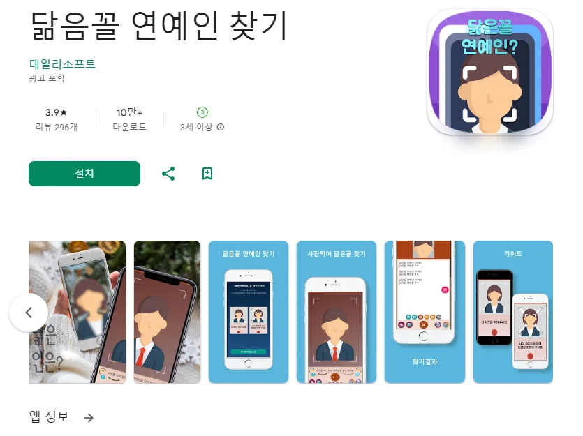 아래는 닮음꼴 연예인 찾기 어플에 대한 스크린샷 정보입니다.