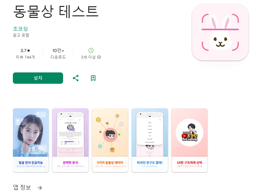 이 어플은 구글플레이스토어에서 "닮은꼴 연예인 동물상 찾기"로 검색했을때 3번째로 나오는 어플입니다. 아래는 동물상 테스트 AI 어플에 대한 자세한 설명이니 참고하세요.