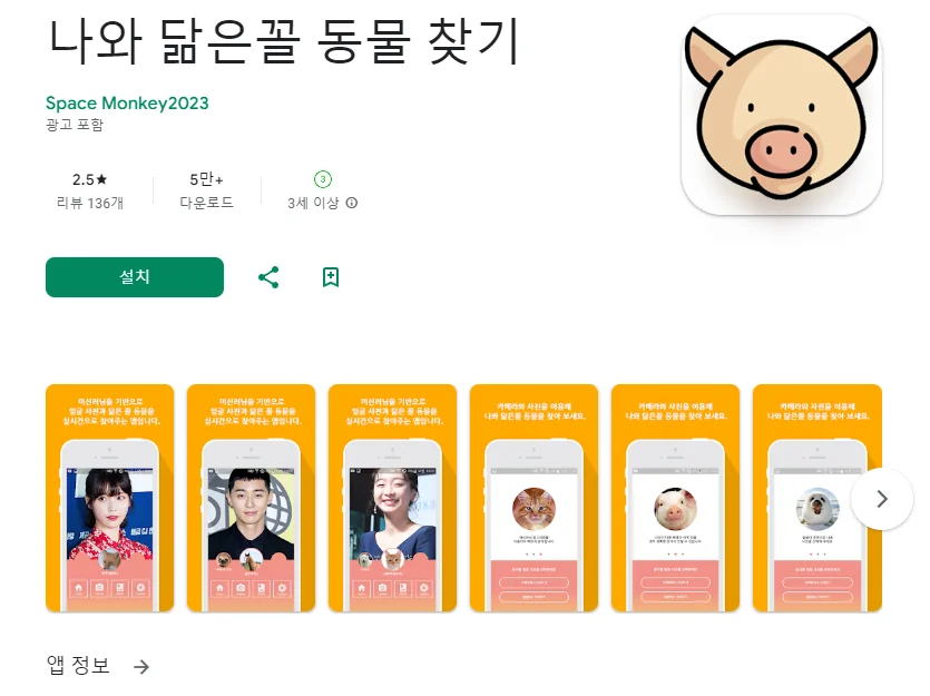 이 어플은 구글플레이스토어에서 "닮은꼴 연예인 동물상 찾기"로 검색했을때 1번째로 나오는 어플입니다. 아래는 나와 닮은꼴 동물 찾기 어플에 대한 자세한 설명이니 참고하세요.