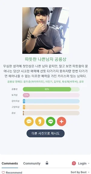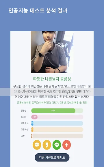 ▶ 평소에도 곰상 소리 많이 듣는데 사진으로 테스트해 보니 100퍼센트 곰상이라고 나오네요. ㅋㅋ 얼굴 정면으로 찍은 사진은 전부 다 100퍼 곰상 ㅋ 곰상 연예인 조진웅, 마동석 ㅎㅎ 성격분석도 실제 성격이랑 비슷하게 나오네요!