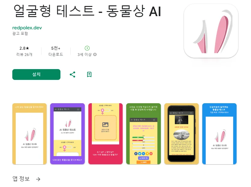 이 어플은 구글플레이스토어에서 "닮은꼴 연예인 동물상 찾기"로 검색했을때 5번째로 나오는 어플입니다. 아래는 얼굴형 테스트 - 동물상 AI 어플에 대한 자세한 설명이니 참고하세요.
