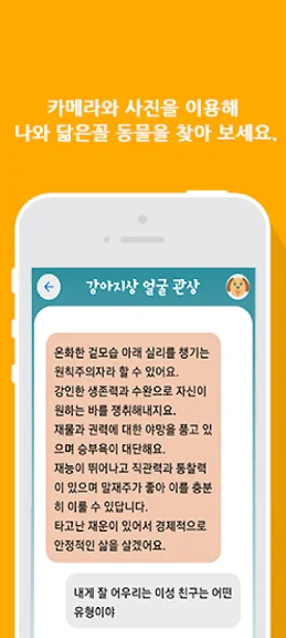 아래는 나와 닮은꼴 동물 찾기 어플에 대한 스크린샷 정보입니다.