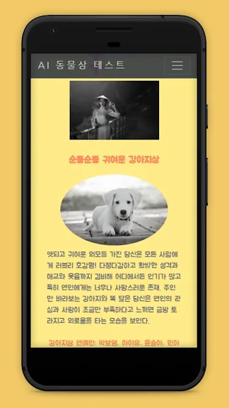 동물상 테스트 AI 어플에 대한 스크린샷 정보가 필요하시다면 아래 이미지를 참고하시기 바랍니다.