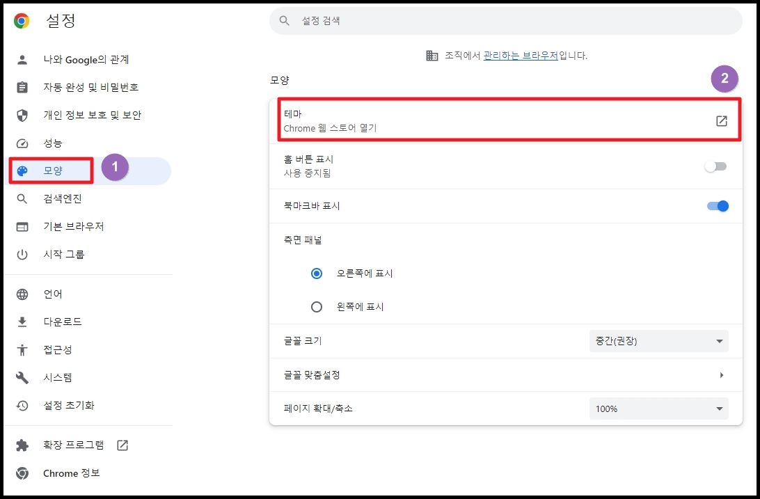 ▼ 그다음 좌측에 "모양" 클릭후 "chrome 웹 스토어 열기" 를 클릭하시면 웹스토어가 열리게 됩니다.