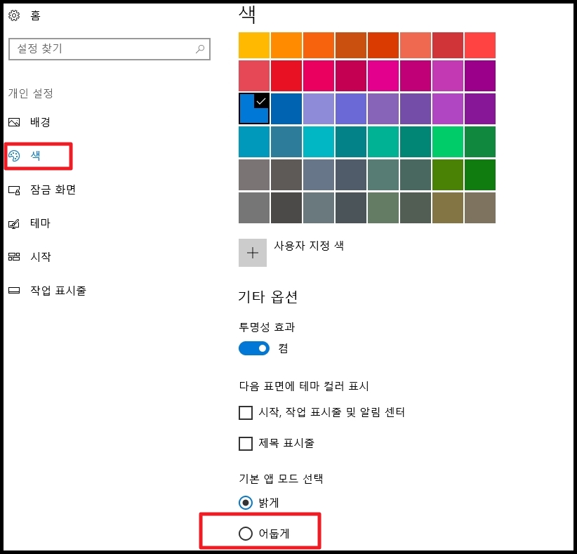 ▼ 그러면 아래처럼 나옵니다. 왼쪽 메뉴에서 "색" 을 클릭하신후 "어둡게" 를 체크하시면 다크모드로 설정됩니다. 이기능을 사용하시면 폴더도 다크모드로 변하고 기본 앱들도 다크모드로 변해서 매우 편리합니다. 모든 앱들을 다크모드로 변경해서 사용하고 싶을때 매우 유용한 기능입니다.