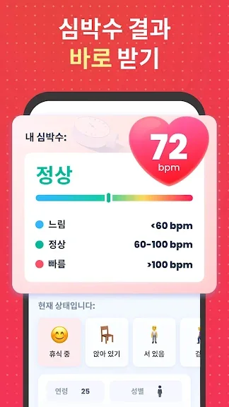 심박수는 신체 건강의 핵심 지표입니다. 건강한 성인에 대한 정상 범위는 분당 60에서 100회입니다. 그러나 자세, 스트레스, 질병 및 신체적 수준과 같은 요인에 영향을 받을 수 있습니다. 따라서, 저희 앱을 통해 정기적으로 심박수를 모니터링하는 것이 좋습니다. 상황을 감지하고 조치를 최대한 빨리 취할 수 있습니다.