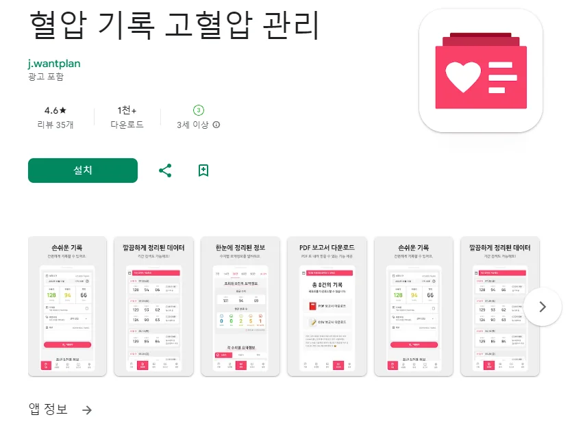 아래는 혈압 기록 고혈압 관리 어플에 대한 스크린샷 정보입니다.