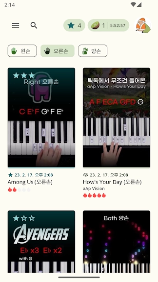 나중에, 앱 사용자는 양 손 연주, 화음 연주 등을 배우게 됩니다.