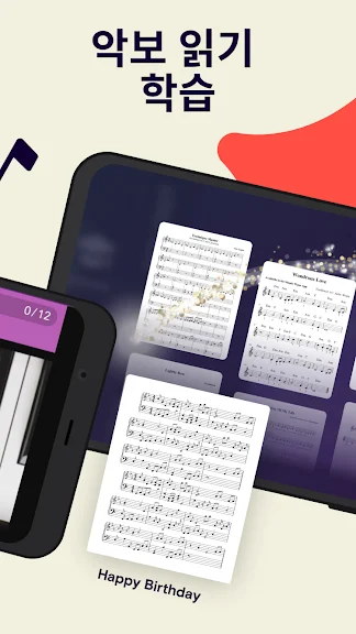 - 모바일 또는 태블릿 장치를 어쿠스틱/MIDI 피아노 또는 피아노 키보드 위에 놓고 연주하세요. 그러면 연주하는 내용을 앱이 즉시 인식합니다