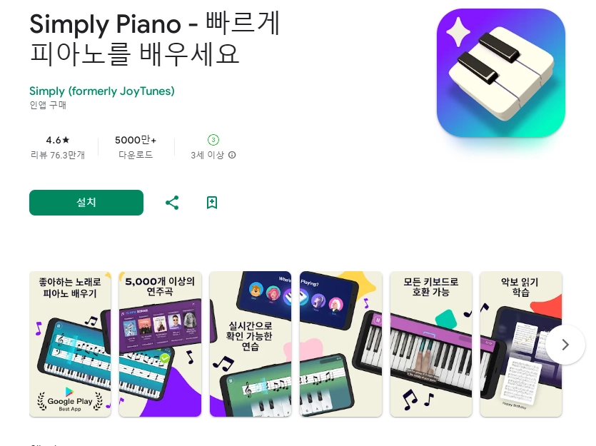 이 어플은 구글플레이스토어에서 "피아노 배우는"로 검색했을때 1번째로 나오는 어플입니다. 아래는 Simply Piano - 빠르게 피아노를 배우세요 어플에 대한 자세한 설명이니 참고하세요.