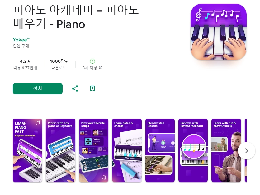 이 어플은 구글플레이스토어에서 "피아노 배우는"로 검색했을때 4번째로 나오는 어플입니다. 아래는 피아노 아케데미 – 피아노 배우기 - Piano 어플에 대한 자세한 설명이니 참고하세요.