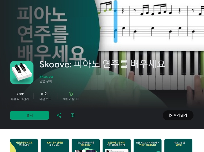 이 어플은 구글플레이스토어에서 "피아노 배우는"로 검색했을때 5번째로 나오는 어플입니다. 아래는 Skoove: 피아노 연주를 배우세요 어플에 대한 자세한 설명이니 참고하세요.
