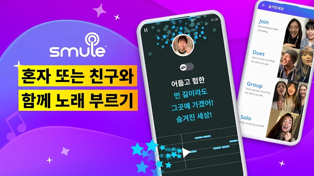 내가 원하는대로 음악을 만들고 녹음해보세요! Smule에서 내 목소리 음역이 더 넓어지게 연습해보고 노래방에서처럼 노래하고, 내 음악을 공유하고 다른 가수들과 함께 작업도 해볼 수 있어요. 노래 음역 가이드와 튜토리얼을 핸드폰으로 보면서 노래하는 법도 배우고 노래를 더 잘하도록 연습해보세요! Smule의 글로벌 커뮤니티는 음악을 사랑하는 사람들과 함께 음악을 나눌 수 있는 곳입니다. 지금 바로 가입하고 듀엣으로 노래도 부르고 전세계에 퍼져있는 음악을 사랑하는 사람들과 함께 24시간 내내 라이브로 노래해보세요.