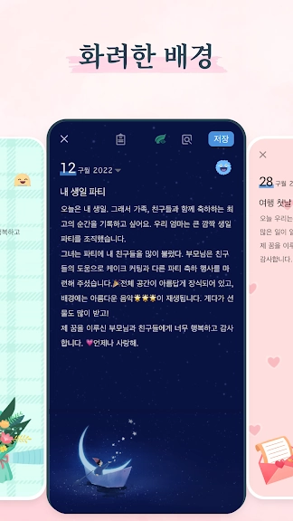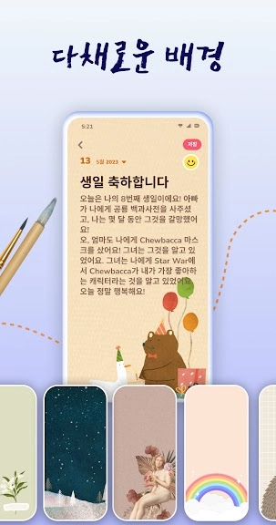 - 일기를 작성 할 때 배경을 선택하여 다이어리를 예쁘게 꾸며 보세요.