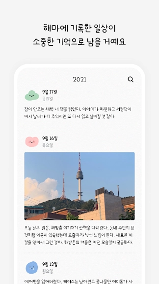 아래는 해마 일기 - 나를 위한 기억 저장소 어플에 대한 스크린샷 정보입니다.